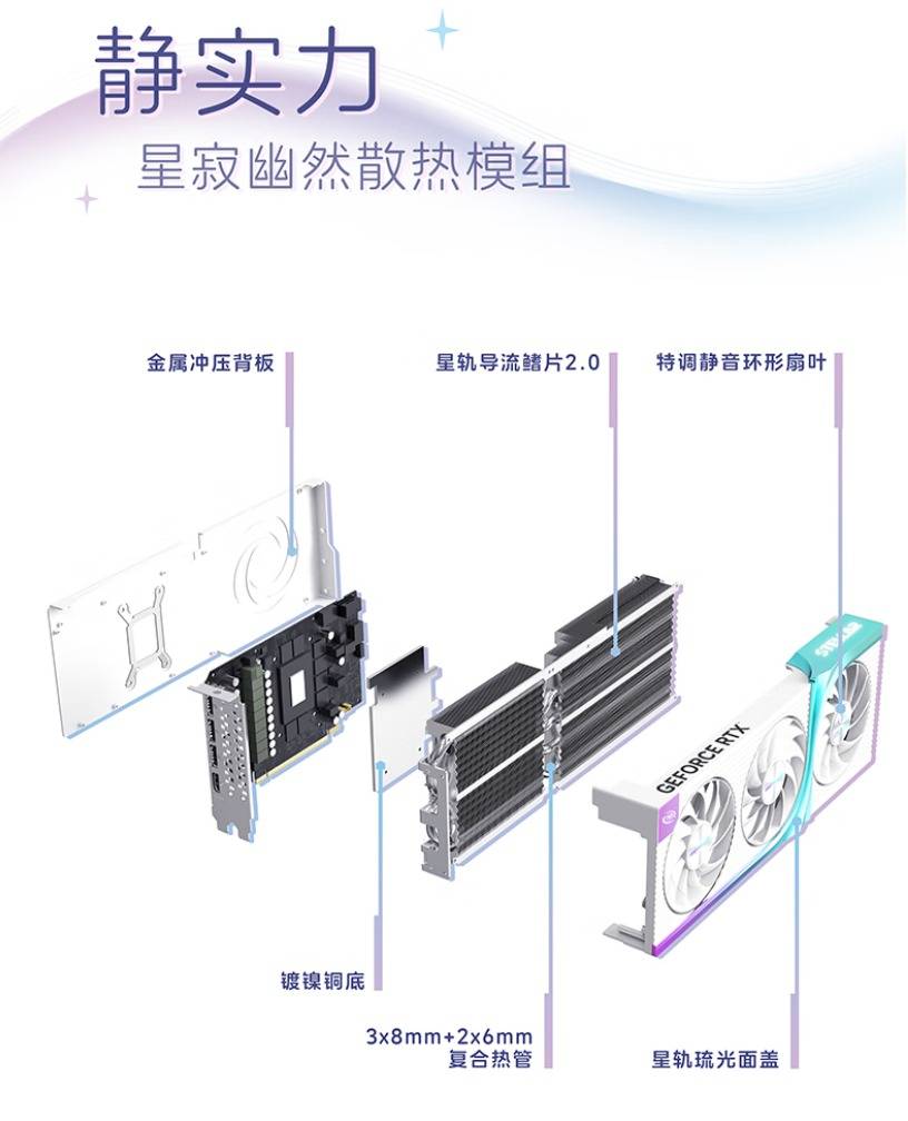 星轨导流鳍片2.0,新一代星轨导流设计有效改变反弹风流方向,减少涡流干扰,实现低分贝静音效果;镀镍铜底复合热管:内置镀镍铜底,搭配3x8mm + 2x6mm复合热管,精准覆盖GPU、显存和电源模块,能迅速均衡地传导热量。