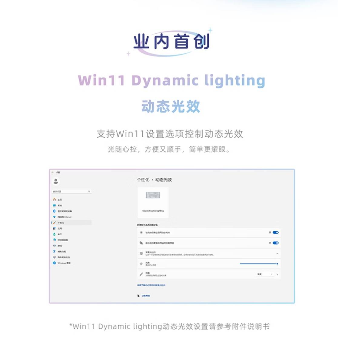 万丽星际系列显卡在业内首创支持Windows 11 Dynamic Lighting动态光效,用户无需安装额外软件,即可通过Windows 11设置选项直接控制动态光效。