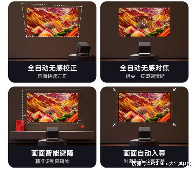 哈趣H3 Ultra Max配备的随心灵动云台,能灵活调节投影方向,单手就能操作;全知AI视觉算法5.0搭配CMOS摄像头模组,实现了全自动无感校正、全自动无感对焦、智能避障和自动入幕四大功能。随手把机器放在沙发边的小桌子上,开机后它会瞬间完成对焦、校正、避障、入幕,把歪歪扭扭的画面调得方方正正