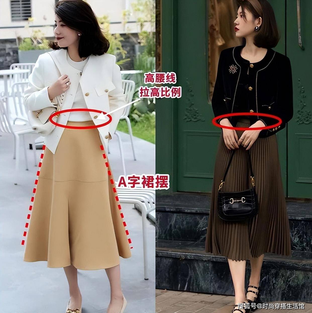 其次像是职场女性或者是出去约会和逛街的话,我们选择小香风进行搭配的时候,自然不能少了高腰半身裙,视觉上看起来会更加的优雅得体和端庄,同时还会显得更加的精致和时髦。那么我们选择高腰半身裙,像是A字裙、直筒裙、百褶裙和伞裙都是不错的选择,搭配上小香风外套能够完美塑造出优雅又有女人味。