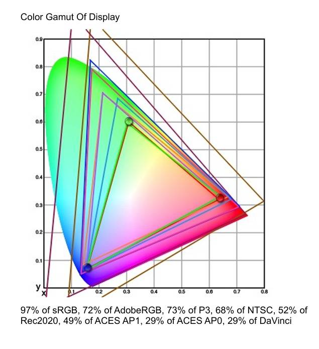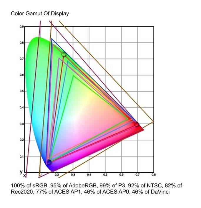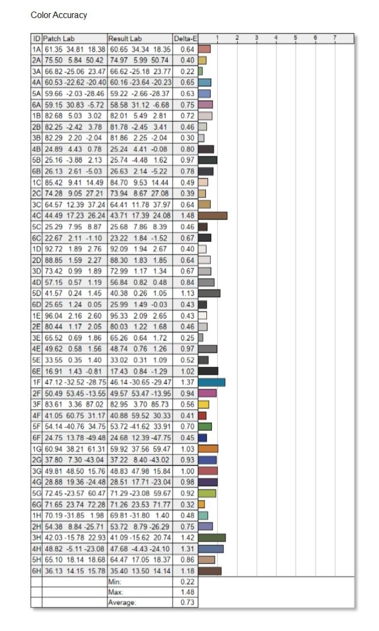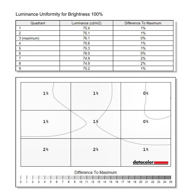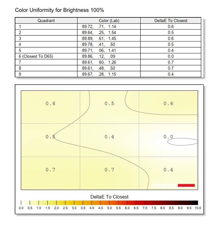 色彩差异的最大ΔE值也仅有0.7。肉眼观看,完全感觉不到屏幕哪个角落有亮度或颜色的不一致,可以说整屏幕亮度分布非常均匀。