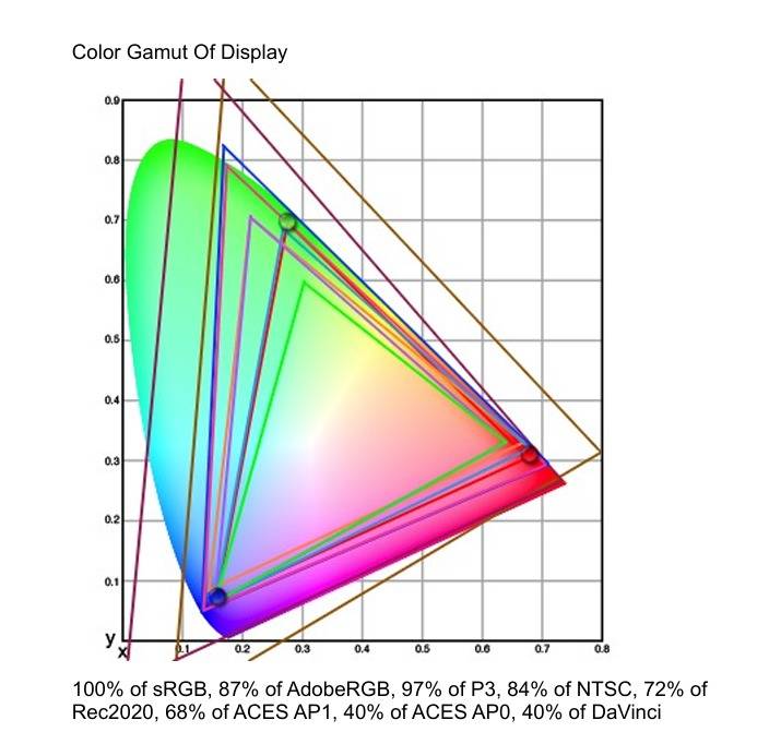 首先来看色域覆盖。在默认模式下,微星 MPG 271QR QD-OLED X50流光实测可以达到 100% sRGB、99% DCI-P3、95% Adobe RGB 和 92% NTSC 的色域覆盖率。表现极为优秀。特别是接近100%的P3色域覆盖率,意味着在观看影音内容或玩游戏时,能够准确呈现创作者想要表达的饱满色彩。而95%的Adobe RGB色域覆盖则对专业制图、视频调色用户非常友好。