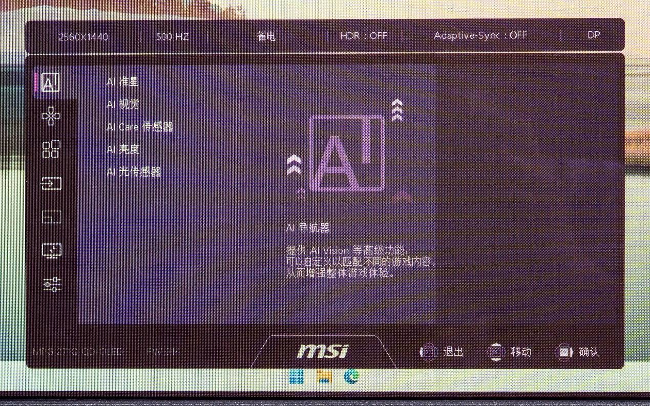 说回OSD本身,微星 MPG 271QR QD-OLED X50流光的菜单界面布局清晰美观且支持设置多语言。主菜单分为几个一级栏目:AI、游戏、专业、输入源、OLED面板保护、系统设置等,将不同功能直观的进行了归类。