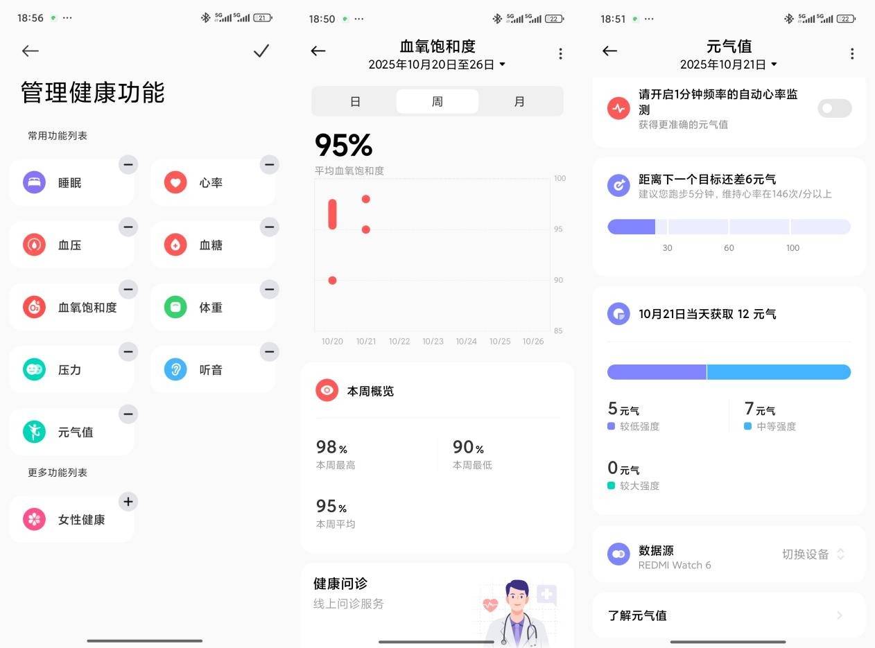 不得不说,心率和血氧饱和度这两大维度,是现如今的智能手表在身体监测方面必备的。除此以外,REDMI Watch 6对比还增建了血压、血糖、压力和听音监测。以售价来看,REDMI Watch 6的升级,不仅“加量不加价”,而且基本照顾到成年人日常所需,称得上是与时俱进。