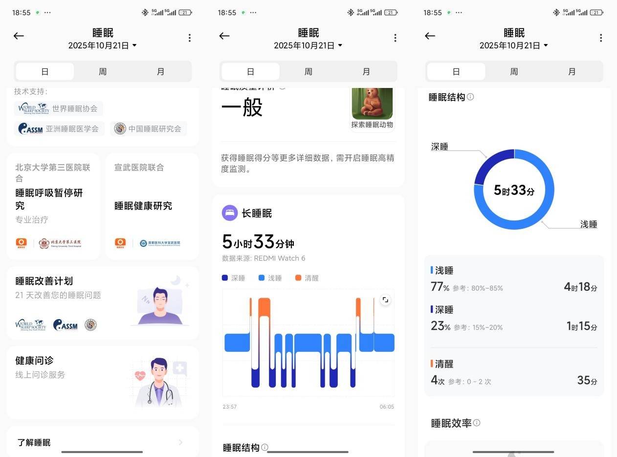 而在原有的检测项目上,REDMI Watch 6也进行了提升。以睡眠监测为例,REDMI Watch 6得到了世界睡眠协会、亚洲睡眠医学会和中国睡眠研究会提供技术支持,并且联合北京大学第三医院实现了睡眠呼吸暂停研究,以及联合北京宣武医院实现了睡眠健康研究。在此基础上,REDMI Watch 6提供的睡眠改善计划和健康问诊,无疑可信度提高了不少。