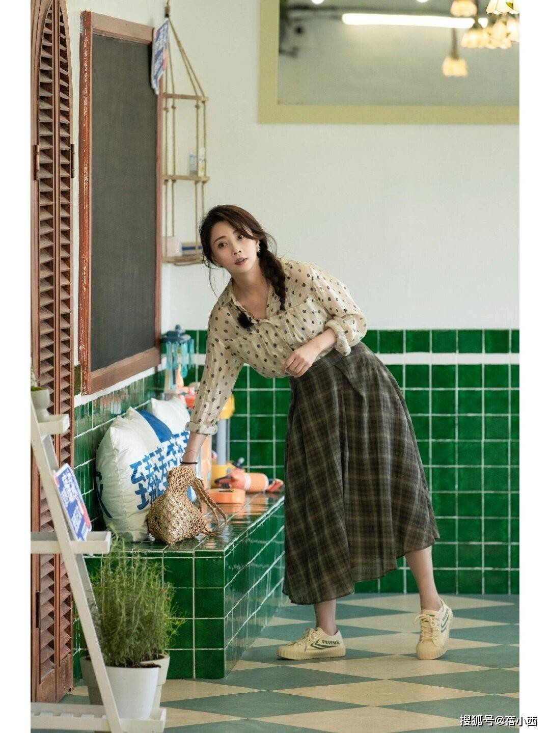 衬衣选对了,整体造型的高级感能提升不少。殷桃身上穿的衬衫不一般,融入了黑色小圆点,在它们的点缀下,衬衣时尚感瞬间爆棚。腿上选了一条半身裙,裙子有小方块设计,颜色和排列有规律性,抢眼又洋气。所穿的半身裙松量较多,是腿不直姐妹的福音。