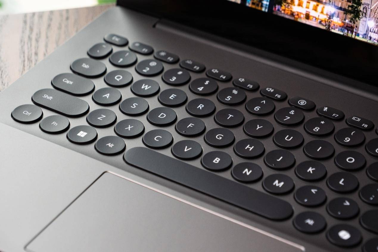 而键盘部分,是这台 Hi MateBook 14 锐龙版最让我意外也最具记忆点的设计之一。它采用了官方称之为“波点艺术键盘”的设计语言——整块键盘区域使用了罕见的圆形键帽,在传统笔记本上几乎见不到这种布局。