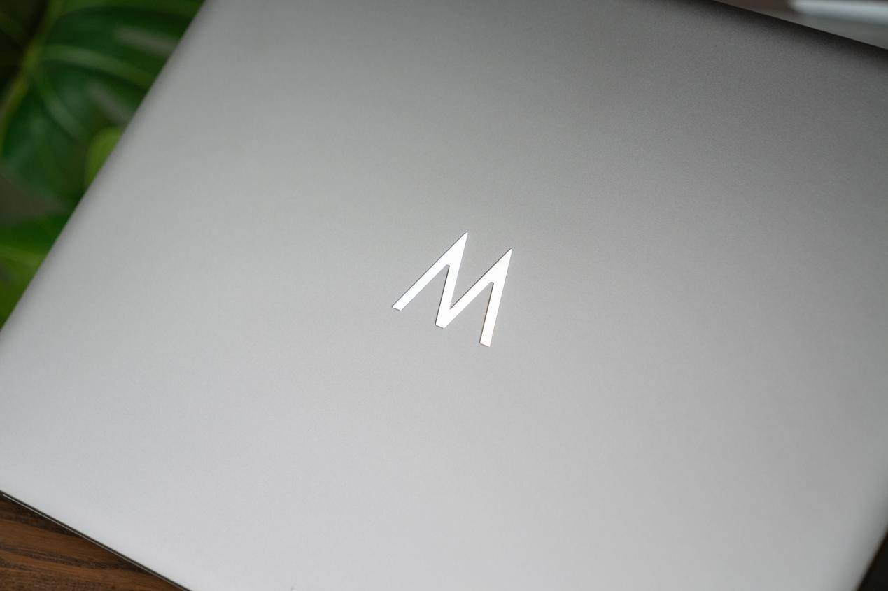 更明显的是,整机的轮廓线条变化。比如边角的弧度更顺滑了、侧面的收边更干净,尤其是转轴区域,从以往的那种“技术性拼接”变成了完整的几何过渡。视觉上更整体,手感也更圆润。极夜灰的机身配色沉稳大气,而那枚金属质感的 M Logo,更像是宣告Hi MateBook也有了属于自己的图腾感。