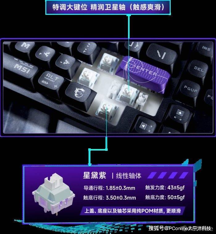Gasket结构 + KTT星黛紫轴:Gasket结构通过软性连接和多重填充棉,带来了柔和、一致且杂音极少的敲击手感。搭配备受好评的KTT星黛紫线性轴,触发轻快,顺滑跟手,无论是游戏连招还是长时间码字,都能提供舒适安静的体验。