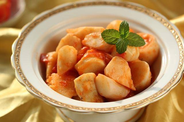 第二道菜: 番茄烧山药,山药是不可多得的健脾养胃食材,它营养丰富, 富含多种维生素、矿物质和膳食纤维,有助于增强脾胃功能,促进消化吸收,有利于身体健康。山药口感绵软,味道清甜,既能入菜,也可作主食,还能当作零食。将它蒸熟后放入番茄汁中煮一煮,营养丰富又易于消化,尤其适合肠胃虚弱的人,养护脾胃,增强免疫力。