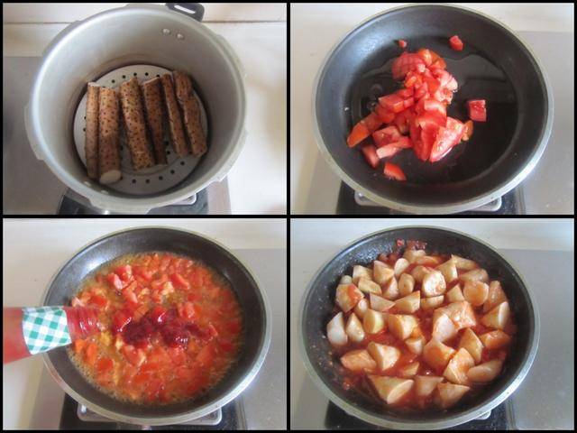 制作过程: 将铁棍山药段放在蒸锅中,大火蒸上十二分钟左右,将其蒸熟,蒸熟的山药去皮后切成小段备用; 烧热锅放入适量的油,加入准备好的番茄粒放进锅中煸炒至微微出汁, 加入少许番茄沙司翻炒均匀,加入1勺糖和适量的盐,再将准备好的铁棍山药段放进锅中焖煮两、三分钟即可盛入钵中。