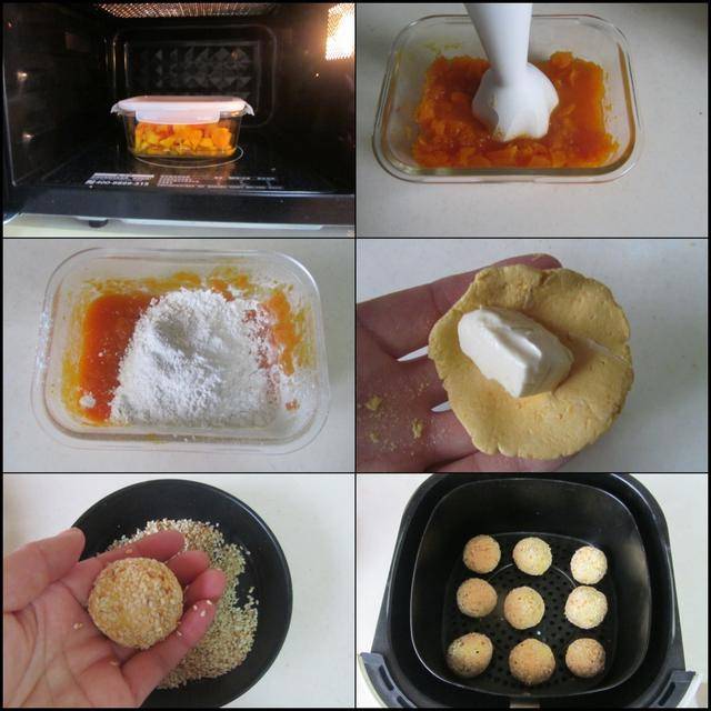 制作过程: 将南瓜去皮后切成小块, 加入少许水, 放在保鲜盒中放入微波炉中高火打5分钟,将其打熟(或者蒸熟) 备用。 将蒸熟的用电动搅拌器搅打成泥,再加入适量的糯米粉拌均匀和成光滑的南瓜糯米面团。 取出少许面团,按压成圆片状,包入1小块奶酪,包裹成球,再放入熟白芝麻中滚动, 让南瓜球表面都沾上白芝麻。 空气炸锅预热, 再将制作好的南瓜球放入空气炸锅中, 180度烘烤6-8分钟,将其烤熟即可。