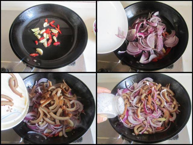制作过程: 将卤熟的牛肚和洋葱切成细丝备用; 烧热锅放入适量的油, 加入少许蒜丝和红椒丝放进锅中煸炒香,再加入洋葱丝放进锅中煸炒香,加入熟牛肚条放进锅中煸炒几下, 加入1勺生抽上色, 再加入少许盐调味, 翻炒均匀即可。