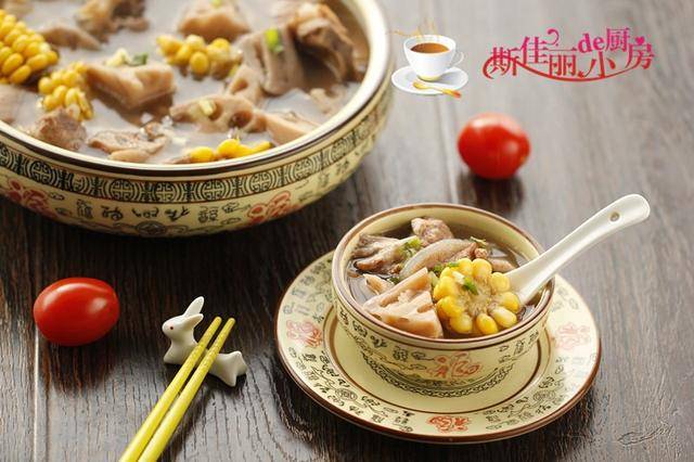 第四道:玉米莲藕棒骨汤 ,秋冬玉米大量上市,民间素有“玉米营养价值赛黄金”的说法,在所有主食中,玉米的营养价值和保健作用是最高的, 玉米性甘、平,归胃、膀胱经, 具有健脾渗湿、利尿消肿、调中开胃、益肺宁心、清湿热等功效。将玉米搭配上莲藕和棒骨一起炖煮,鲜美又好喝,还营养易吸收, 滋阴又润燥。