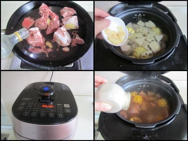 制作过程: 将莲藕和水果玉米切成小块; 棒骨块放进锅中焯水,加入少许姜片和高度白酒焯水,焯出浮沫后捞出放入电炖锅中,加入几片姜, 再加入适量的水,注意煲汤时水要一次性加足, 不要中途加水,按下电炖锅上炖煮骨汤的功能键, 最后炖煮好后加入少许盐和胡椒粉调味,撒入少许葱花即可。