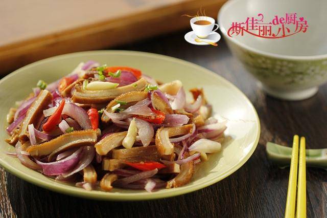第三道:洋葱炒牛肚,都说,”吃啥补啥“ ,牛肚是一种养分价值特别高的食材,富含蛋白质,以及钙与铁还有磷等多种微量元素,还含有核黄素和尼克酸和氨基酸等物质 , 性温,能够入脾经和胃经,不仅能补益气血 ,还能健脾养胃,有着显着的滋补效果。将它搭配上富含抗菌素的洋葱简单一炒,鲜香味美又好吃下饭,秋冬季节养脾胃不妨多吃。