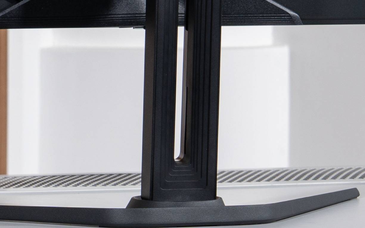 让我们先从AORUS FO27Q5P的支架看起,为了确保桌面上的稳定性,AORUS FO27Q5P采用了稳定性极佳的V型底座,并且使用了大量的金属材质。