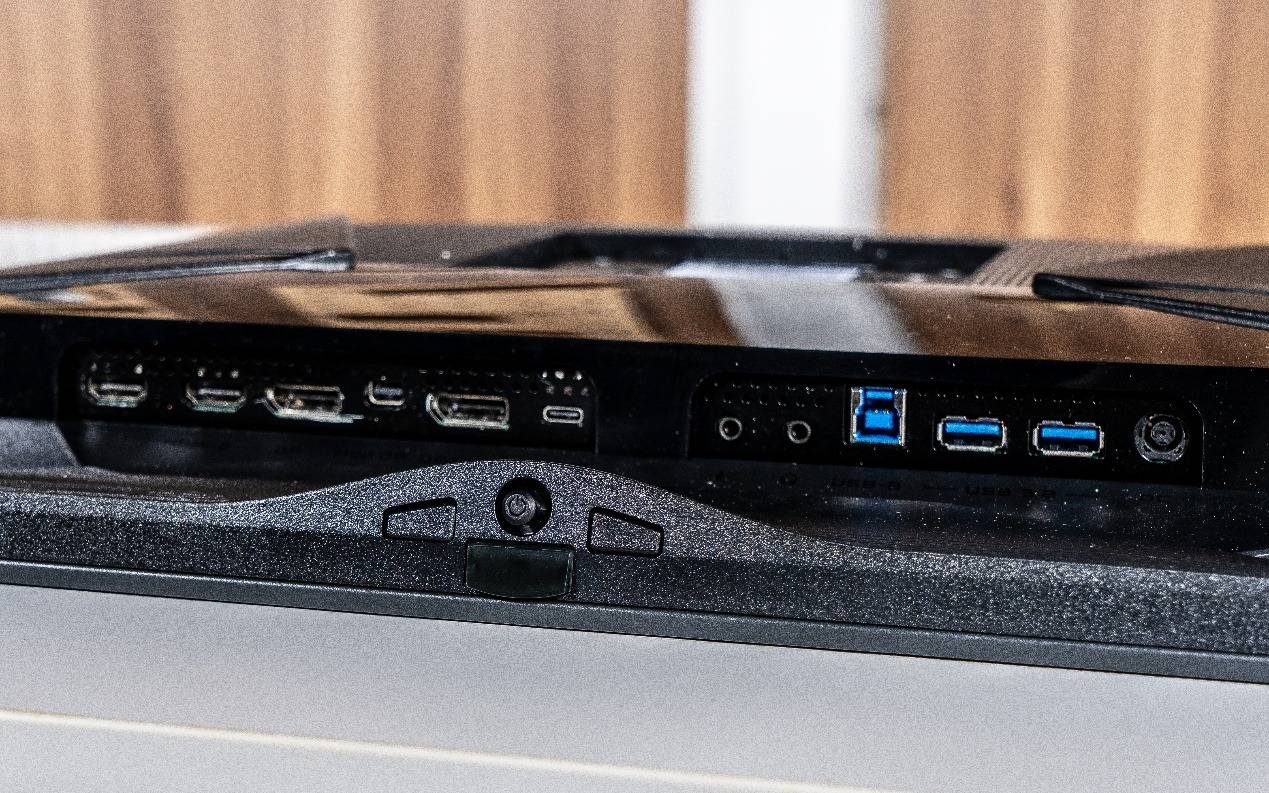 接口与扩展性方面,AORUS FO27Q5P可谓武装到牙齿。所有接口均被设计在机身背部下沿,并为了方便理线分成了两个区域。其中视频接口包括2个HDMI 2.1、1个全尺寸DisplayPort 2.1、1个Mini DisplayPort 2.1,以及1个用于菊花链的DisplayPort 1.4输出。