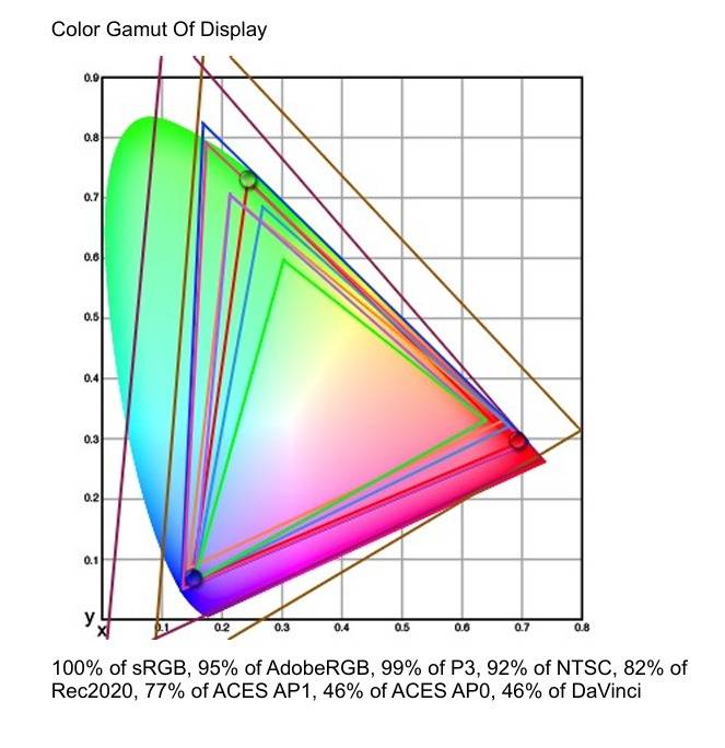 作为一款QD-OLED显示器,AORUS FO27Q5P的色彩表现是其核心优势之一。经过实测,该显示器能够 100% 覆盖 sRGB 色域 ,并同时能够达到99% 的 P3 (DCI-P3) 色域覆盖。此外,它还覆盖了 95% 的 Adobe RGB 色域。这样的色域表现证明了其拥有卓越的色彩还原能力。