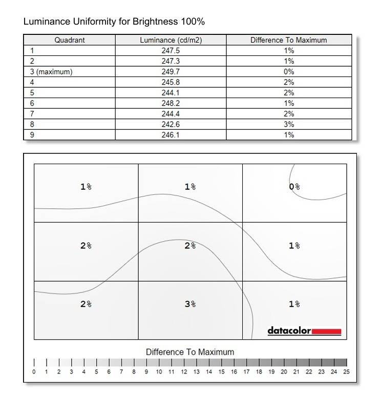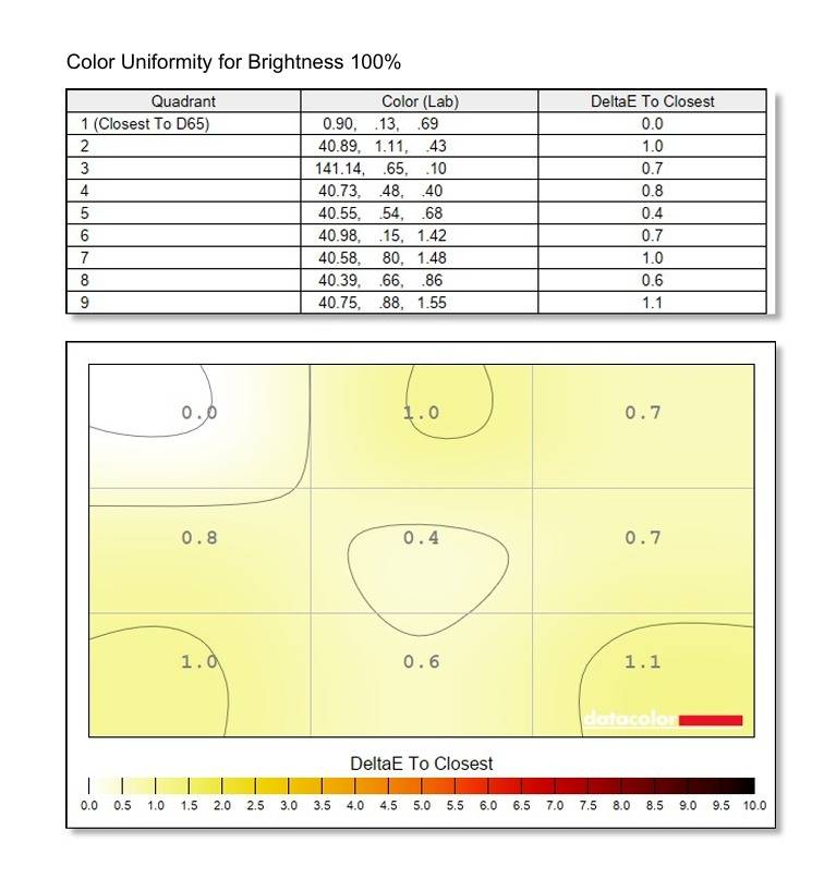 在100%亮度下 ,AORUS FO27Q5P的色彩均匀性表现出色。最接近D65标准的区域为1号区域(屏幕左上角),而其他区域的最大差值ΔE仅为 1.1 ,出现在屏幕右下角的9号区域。这一结果证明FO27Q5P在显示时具有极高的色彩一致性。