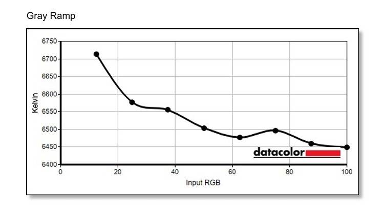 而在灰阶表现方面,AORUS FO27Q5P的色温曲线在不同灰度下有轻微波动,整体在6720K至6450K之间浮动,但曲线丝滑,表现较为稳定。