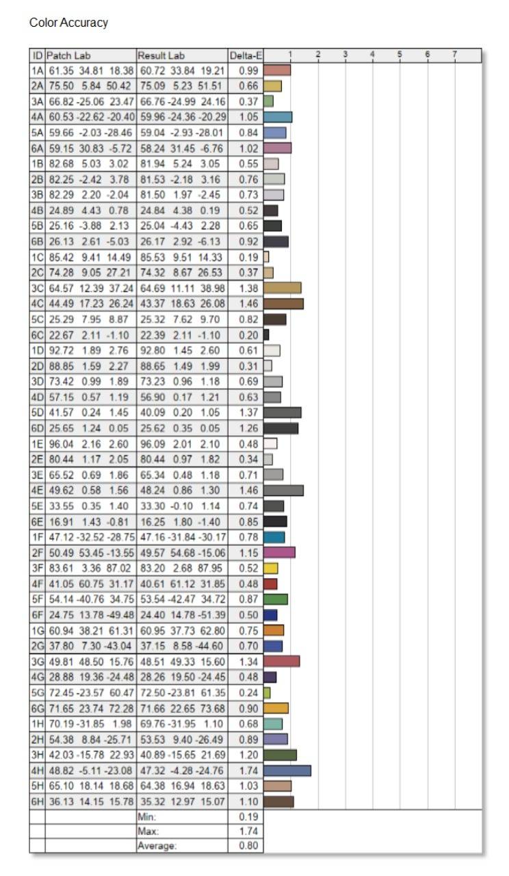 色准是本次测试中AORUS FO27Q5P的最大亮点之一 。在对48种颜色进行测试后,其平均ΔE值仅为 0.80,最大ΔE值也只有 1.74 。这表明AORUS FO27Q5P不仅是一台拥有极致速度的电竞显示器,同时也具备了专业级监视器的色彩还原能力,真正做到了速度与画质兼备。