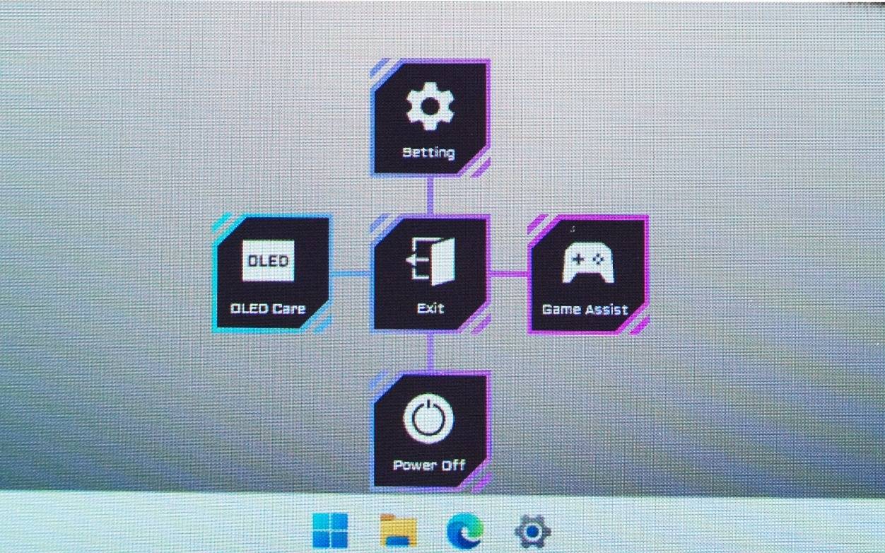 按下摇杆则可以呼出主菜单界面。在按下摇杆的一瞬间,屏幕上会先弹出一个快捷菜单:包含设置、OLED Care、Game Assist和Power Off四个选项,可以直接选择相应功能或进一步进入完整的设置菜单。