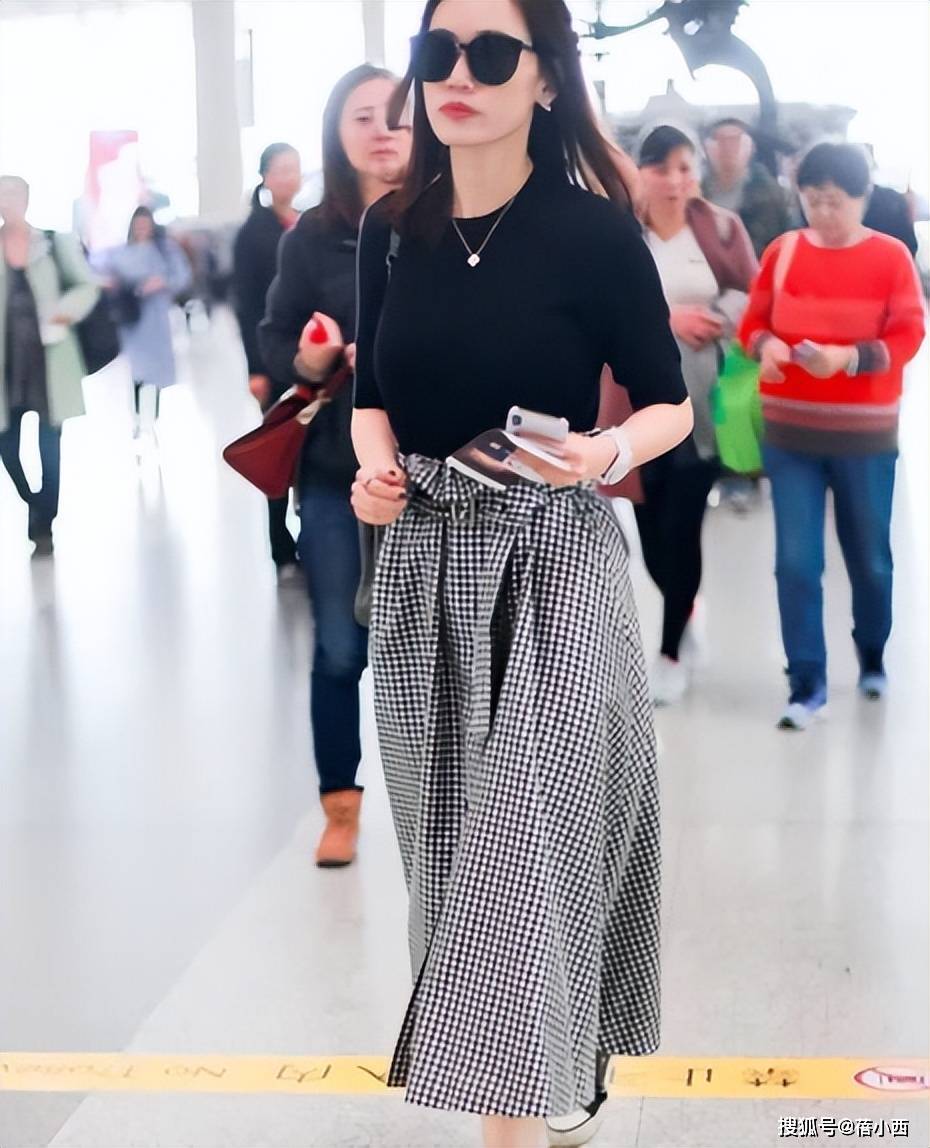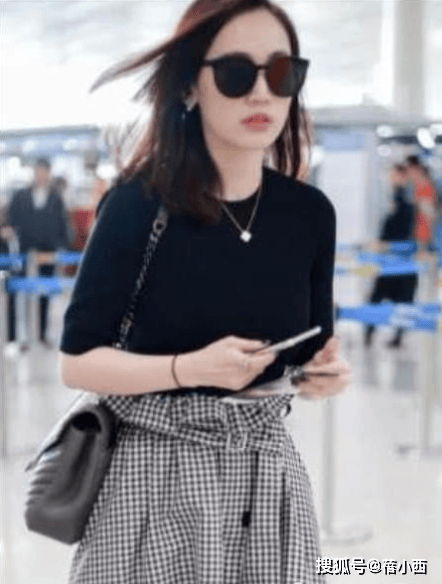 机场中,马蓉的搭配总是特别慵懒和随性,比如她这一身搭配选择了简约的黑色t恤,正肩剪裁恰好贴合肩线,不松垮也不过分束缚身材,圆领衬得脖颈线条更舒展,没有多余装饰,却更高级了,适合日常搭配。