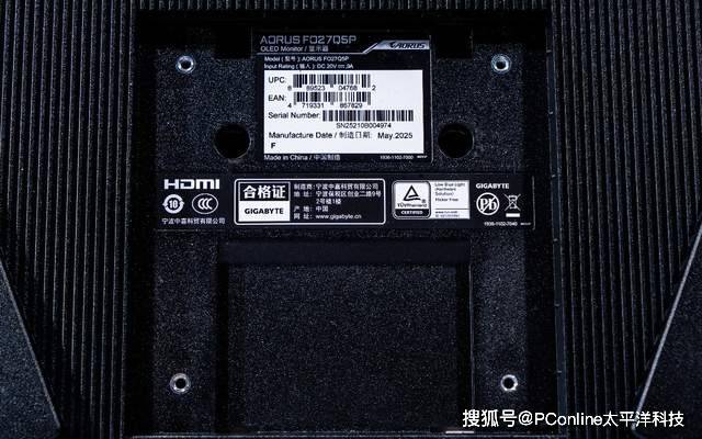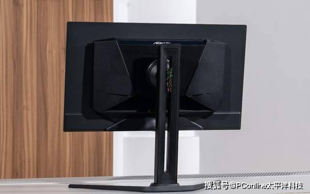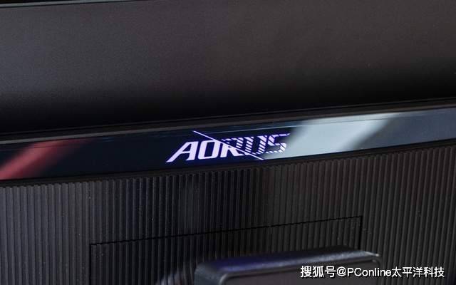 相较于低调的正面,AORUS FO27Q5P的背面造型则充满了电竞显示器应有的炫酷感。在大面积的磨砂纹理背板中间,有一块条纹纹理的梯形区域,犹如机甲的装甲,而在这块梯形区域的上方,AORUS 在这里搭载了带有RGB背光的AORUS品牌铭牌。通过点阵式的灯带展现“AORUS”字样,为玩家的桌面增添电竞赛场的氛围。