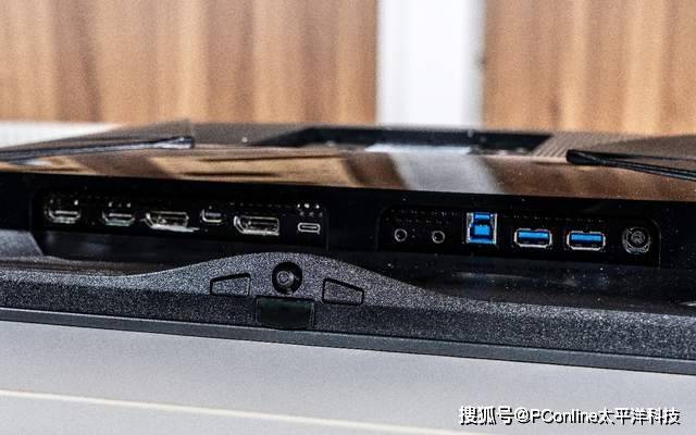 接口与扩展性方面,AORUS FO27Q5P可谓武装到牙齿。所有接口均被设计在机身背部下沿,并为了方便理线分成了两个区域。其中视频接口包括2个HDMI 2.1、1个全尺寸DisplayPort 2.1、1个Mini DisplayPort 2.1,以及1个用于菊花链的DisplayPort 1.4输出。