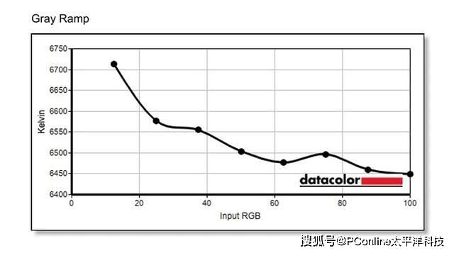 而在灰阶表现方面,AORUS FO27Q5P的色温曲线在不同灰度下有轻微波动,整体在6720K至6450K之间浮动,但曲线丝滑,表现较为稳定。