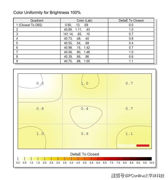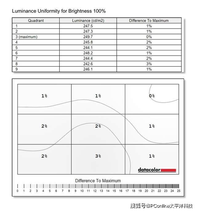 至于亮度均匀性方面,OLED的自发光特性再次展现出了极高的优势。在100%的最大亮度下 ,屏幕的最大亮度区域位于3号区域(右上角) 。最大的亮度偏差区域出现在屏幕底部中央的8号区域 ,但差值仅为3% 。这是一个非常优秀的成绩,肉眼几乎无法察觉亮度差异。