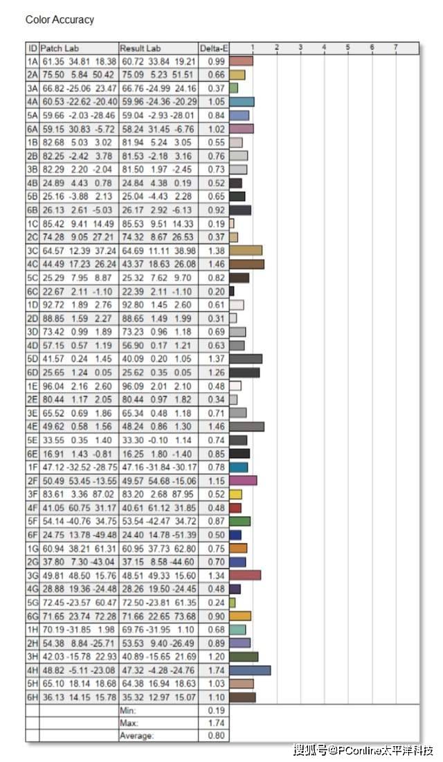 色准是本次测试中AORUS FO27Q5P的最大亮点之一 。在对48种颜色进行测试后,其平均ΔE值仅为 0.80,最大ΔE值也只有 1.74 。这表明AORUS FO27Q5P不仅是一台拥有极致速度的电竞显示器,同时也具备了专业级监视器的色彩还原能力,真正做到了速度与画质兼备。