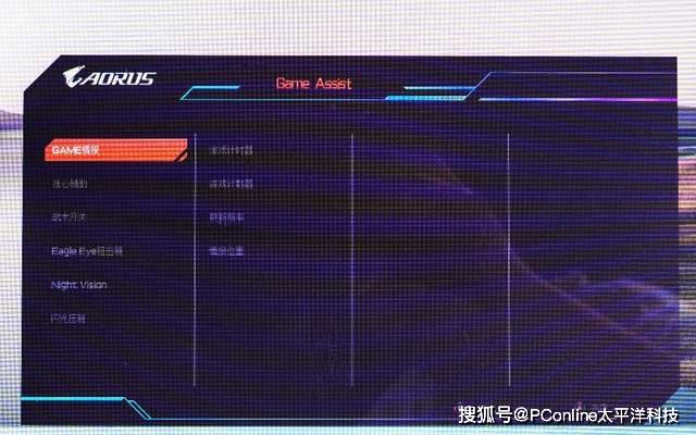 设置菜单布局: 进入Sstting菜单后,可以看到技嘉使用了六大分类的纵向菜单结构,每一类下有对应的功能选项。具体分类包括:游戏功能、图像功能、显示功能、PIP/PBP、系统功能和清除所有设定值。