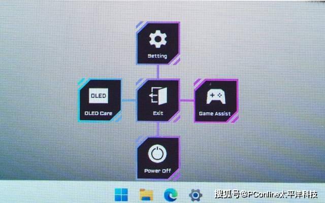 按下摇杆则可以呼出主菜单界面。在按下摇杆的一瞬间,屏幕上会先弹出一个快捷菜单:包含设置、OLED Care、Game Assist和Power Off四个选项,可以直接选择相应功能或进一步进入完整的设置菜单。