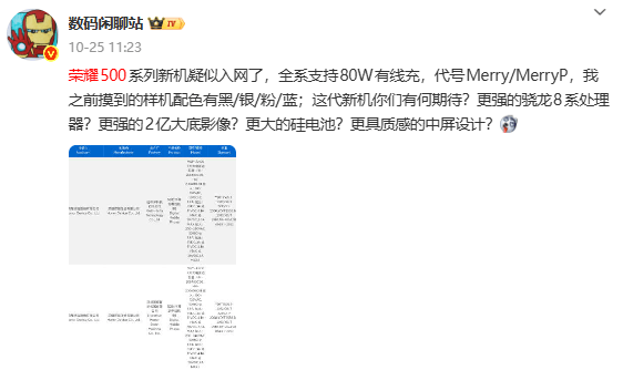 该博主此前曾透露,荣耀 500 系列将全系支持 80W 有线充电,内部代号为 Merry/MerryP。据悉,工程样机提供了黑、银、粉、蓝配色。在配置方面,新机有望搭载更强的骁龙 8 系处理器,配备 2 亿像素大底主摄,并可能采用容量更大的硅电池,以及更具质感的中屏设计。