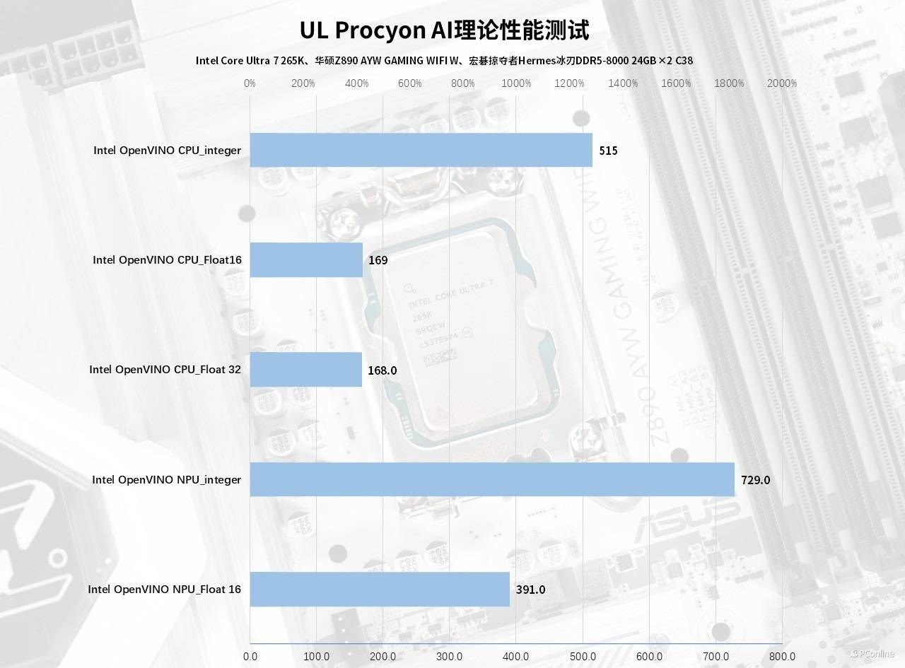 另外,众所周知这代处理器是英特尔首次在桌面端上引入NPU模块,同时核显也进行了全面加强,那我们自然得测试一下这颗处理器的AI表现如何。我们直接用UL Procyon的Intel OpenVINO进行测试。实测在float16以及integer下,NPU的表现非常惊艳,甚至以及超过了CPU本身的AI算力,部分场景下的性能表现甚至是CPU的两倍!