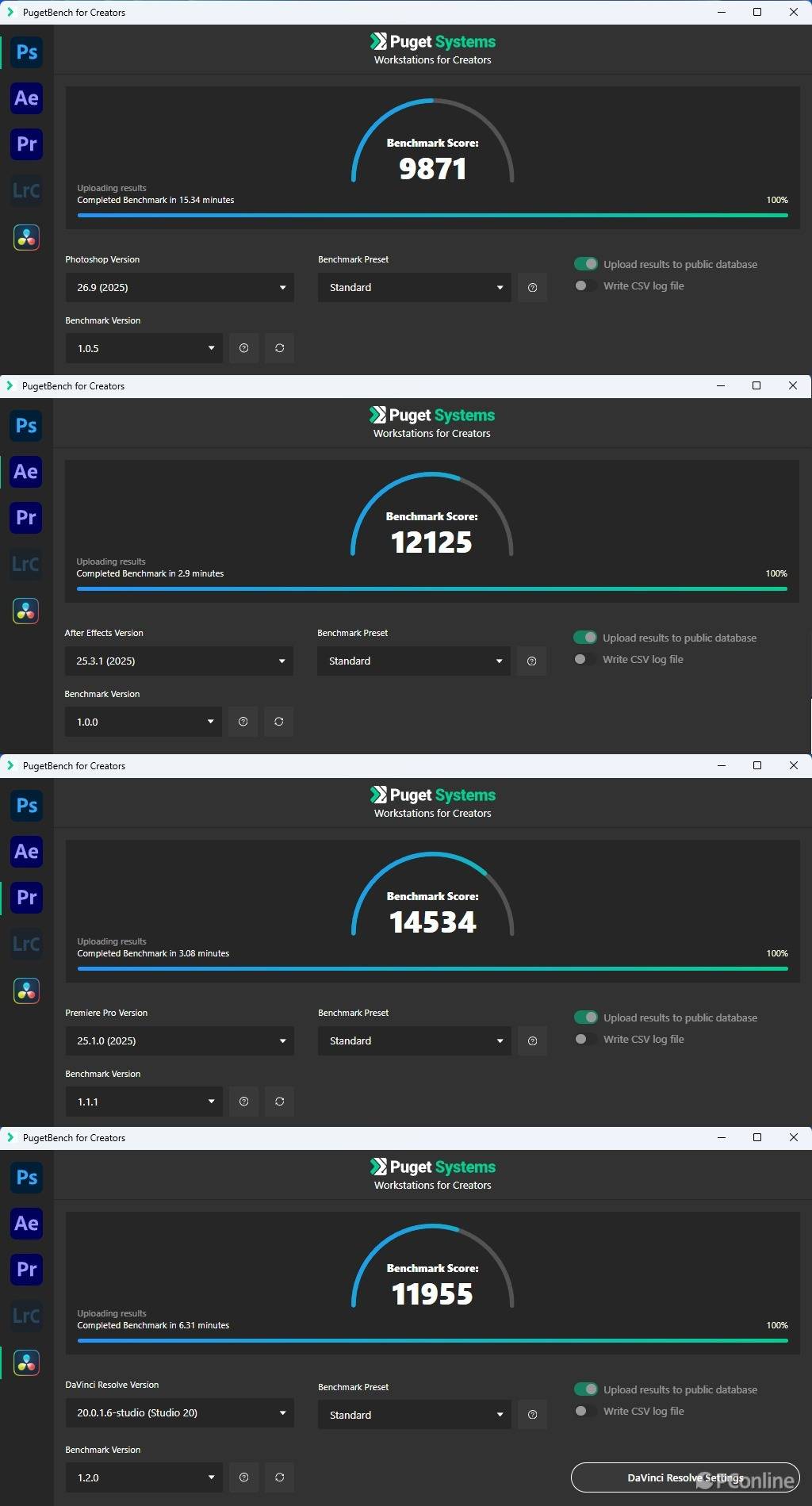 在游戏之外,Intel处理器历来被公认为是“更优的生产力工具”,而酷睿Ultra 7 265K则将这一优势发挥得淋漓尽致。首先我们关注一下大部分用户关心的图像与视频性能,这里我们使用PugetBench模拟日常Adobe等创意软件的使用,实测酷睿Ultra 7 265K在PS、Ae、Pr以及达芬奇中分别得分9871、12125、14534以及11955。它强大的多核性能搭配Intel独有的核显加速,让你无论是拖动4K素材的时间线、添加复杂的特效,还是最终的视频渲染导出,都能感受流畅丝滑的体验。
