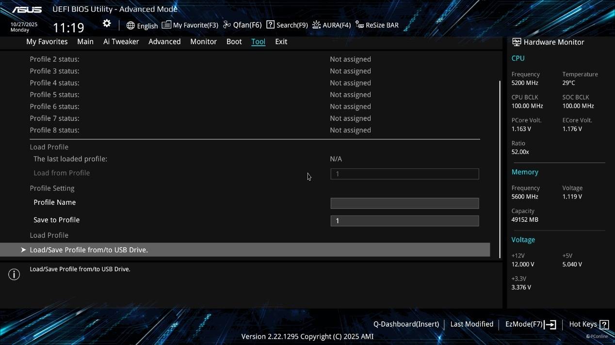 其次开机进入BIOS高级模式下,找到tool菜单,下拉菜单找到Load/Save Profile from/to USB Drive