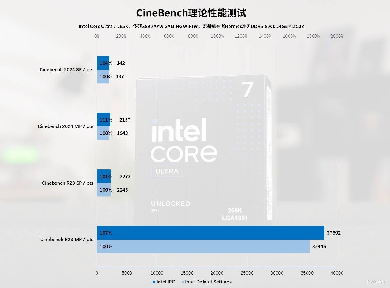 CineBench的情况与CPU-Z中类似,先看R23的表现,在全默认状态下,酷睿Ultra 7 265K的单核与多核成绩分别是2245与35446,开启IPO以后,成绩增长至2273与37892。2024版本中提升更为明显,特别是开启IPO以后,单核提升约4%,多核则提升了11%,非常夸张。