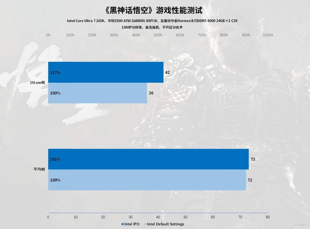 与上面一样,我们还是用1080P分辨率进行测试,首先在3A大作《黑神话悟空》中,开启IPO以后变化最明显的是1%Low帧,提升幅度高达17%。