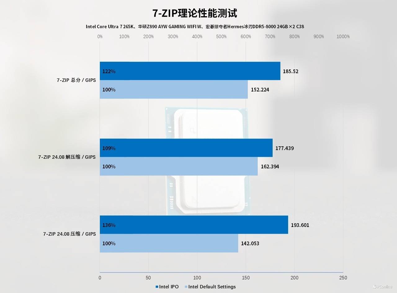 7-Zip则一般用于测试处理器的解压缩能力,这项测试一般与处理器的核心数、线程数相关。不过IPO技术的启用以后,也进一步提升了酷睿Ultra 7 265K的解压缩能力。其中默认状态下,这颗处理器的压缩为142.053 GIPS,解压缩为162.394 GIPS;开了IPO以后,压缩提升了36%,来到了193.601 GIPS,解压则提升9%,为177.439 GIPS,整体性能比默认强了22%左右。