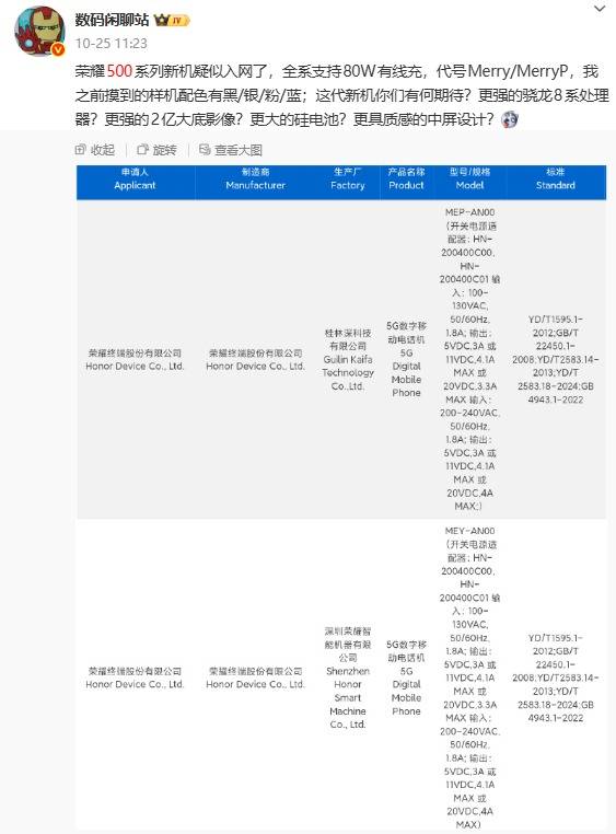 据此前爆料,荣耀500系列在影像、性能、电池及外围配置上均有显著提升,全系支持80W有线快充,代号Merry/MerryP。此前曝光的样机配色包括黑、银、粉、蓝四种,整体质感有所提升。