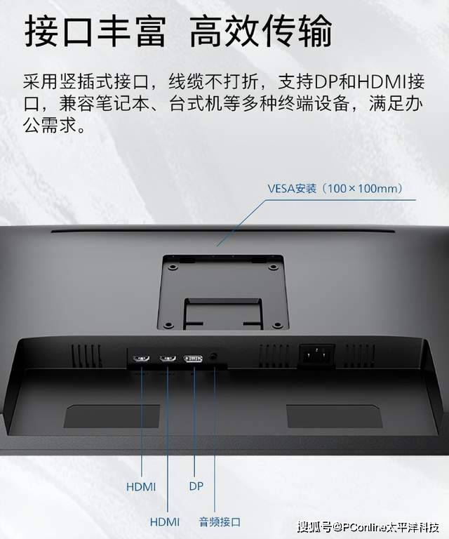 竖插式的接口设计很贴心,插拔线缆时不会出现打折缠绕的问题,既能连接台式机主机,也能适配笔记本电脑,满足多设备切换的需求。兼容性让它不仅能作为主力办公屏,还能临时充当笔记本的扩展屏,灵活应对不同办公场景。