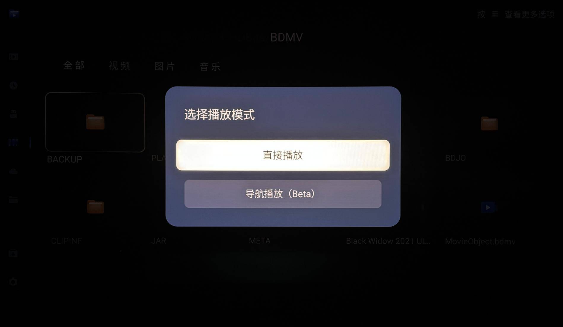 现在X11L已经支持了蓝光原盘导航功能,无论是在海报墙,还是单独打开蓝光原盘的文件夹,现在X11L都会像安卓播放器那样给用户两个选择:直接播放以及导航播放,选择导航播放就可以进入蓝光原盘导航的界面。从我们的体验来看,进入蓝光原盘导航界面所花的时间基本上和蓝光机接近,而且在观看过程中,可以通过遥控器的菜单键弹出蓝光原盘应有的菜单,基本上这就和一台蓝光机没有什么区别了。