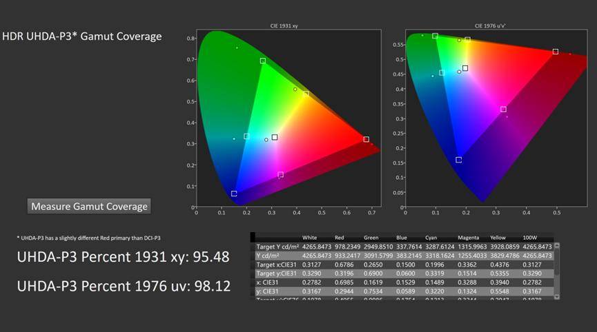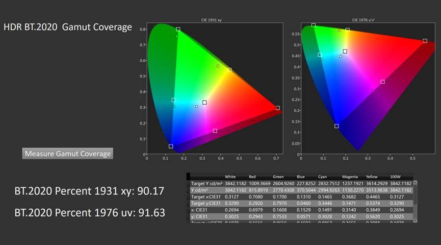 在Filmmaker模式下,98X11L的色温为6600K,伽马值为2.21,这两项都是很好的开箱即用数据。此外在色域部分,98X11L在DCI-P3色域的覆盖率为98%,在BT2020色域下的覆盖率超过91%,这是目前量子点电视最高的色域覆盖率,和RGB-Mini LED电视处于同一档次。