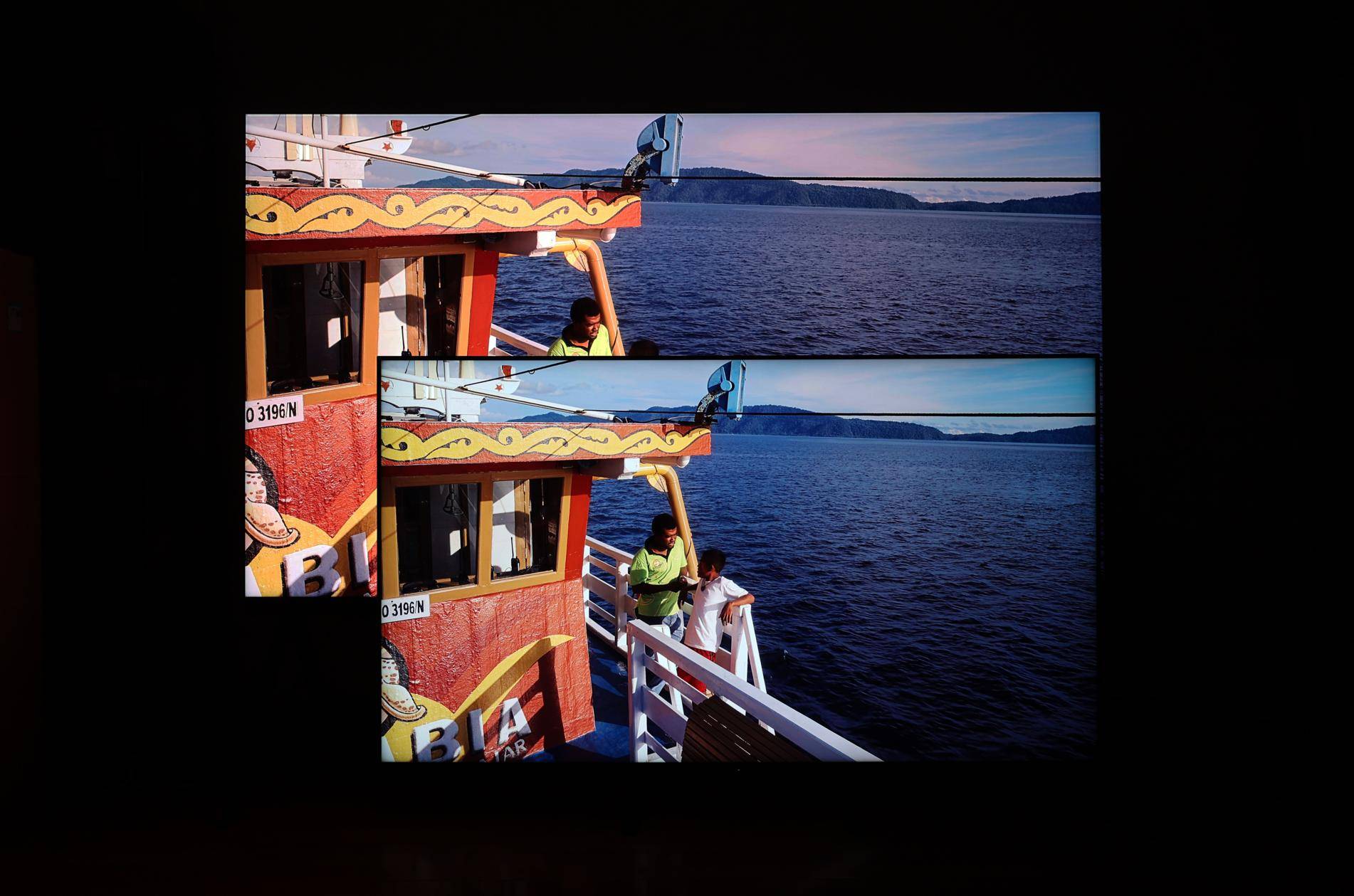 很多视频中,我们都能看到98X11L在局部画面拥有更明亮以及更自然的色彩,对比的电视海水蓝色部分因为亮度不够而显得有一些过暗,天空渲染出的蓝色也差点意思,反而不如98X11L那样结合云彩过渡自然。另外我们也看到像黄色、棕红色这些色彩,98X11L的表现会更好。