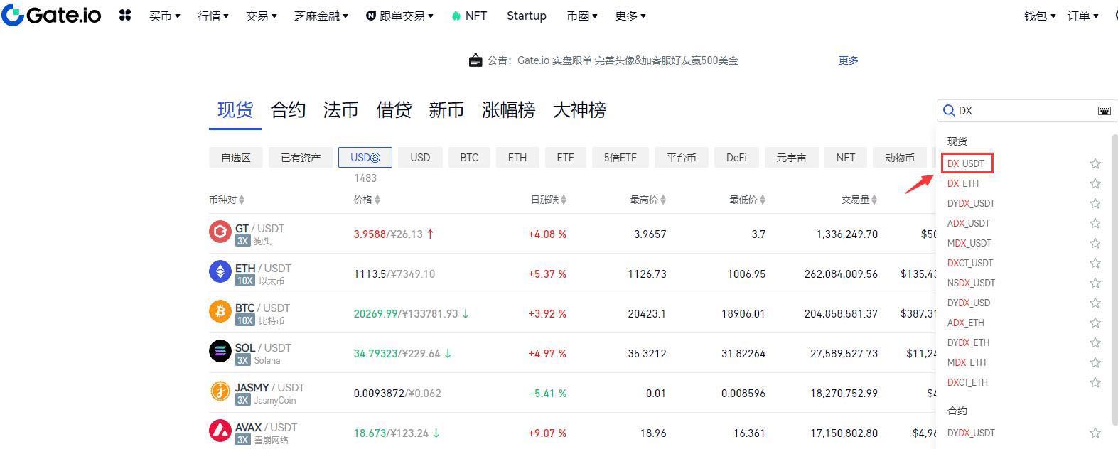 第二步:在交易平台搜索 DX 币(DxChain 的英文简称)。
