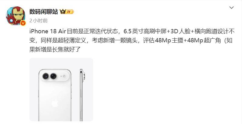 与此同时,博主 @数码闲聊站 今日透露,苹果仍在正常推进 iPhone Air 的后续开发工作。其爆料称,代号为“iPhone 18 Air”(预计即第二代 iPhone Air)的机型将延续6.5英寸高刷中屏、3D人脸识别与横向跑道式设计,主打“超轻薄”理念。苹果目前正在评估新增一颗4800万像素超广角镜头,搭配4800万像素主摄,进一步完善影像系统。