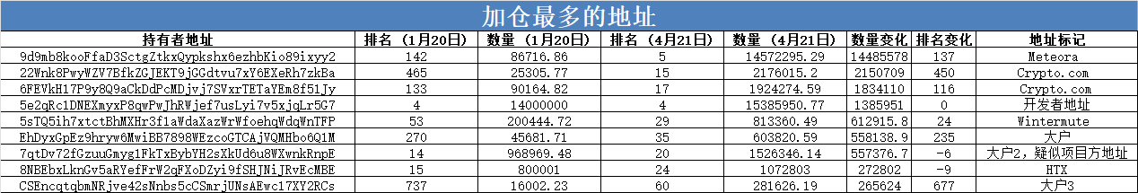 在持续持有的大户地址中,代币的开发地址增加了约 138 万枚代币的持有,不过这些代币大多是由其他小号地址转移回来归集的,并不是购买增持。